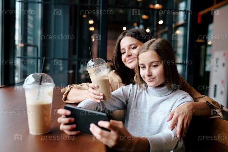Счастливая мать обнимает свою дочь со смартфоном, пока оба смотрят видео