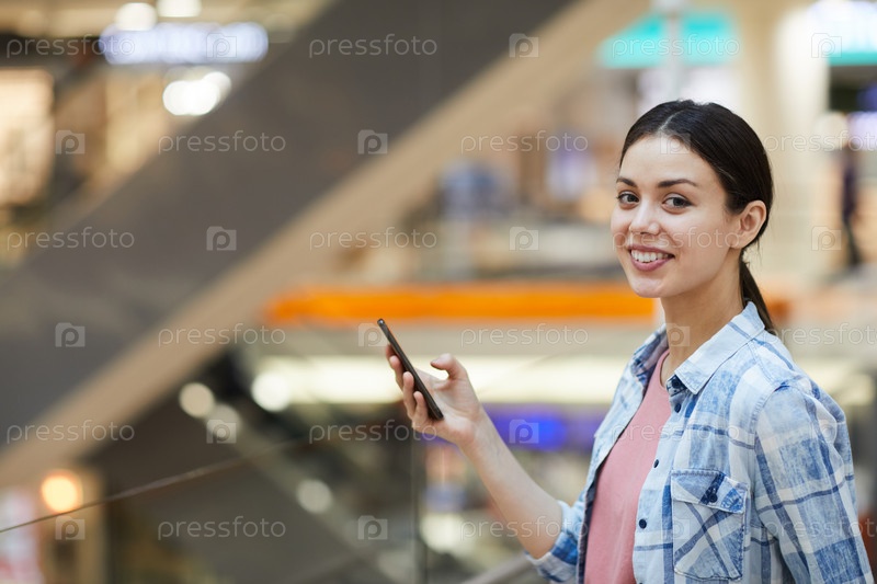 Позитивная красивая девушка с милой улыбкой, одетая в голубую рубашку, стоит в торговом центре и отправляет смс-сообщения в социальных сетях, глядя на камеру