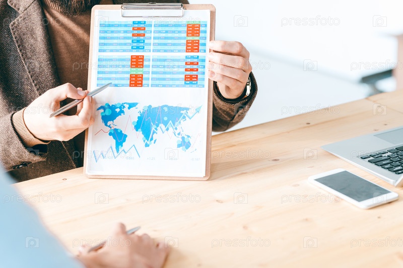 Молодой бизнесмен держит доску с финансовой бумагой и указывает на график