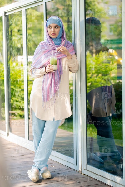 Красивая молодая спокойная женщина в повседневной одежде и хиджабе, выпивающая на террасе
