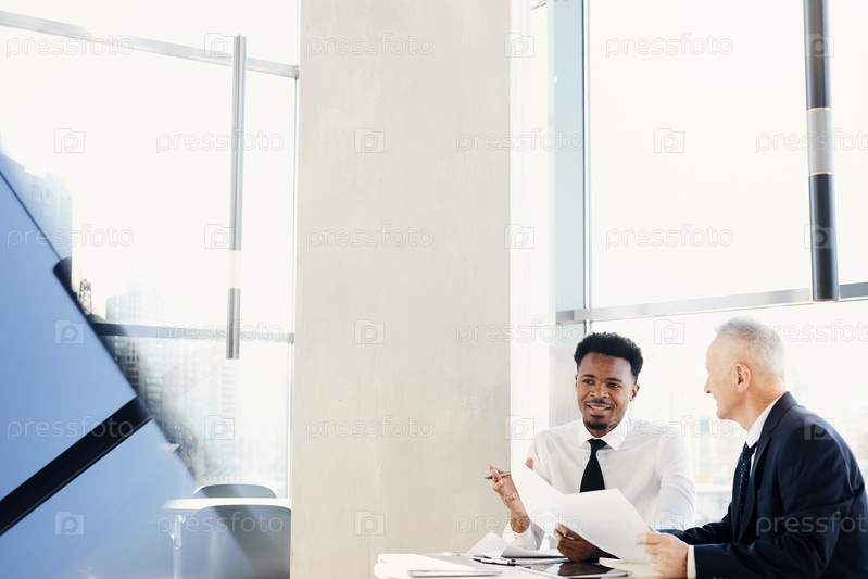 Веселые успешные деловые коллеги в формальных нарядах сидят за столом в современном офисе и вместе рассматривают документы