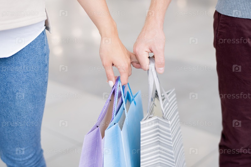 Руки молодой ласковой пары, несущей бумажные мешки и держащих друг друга за пальцы