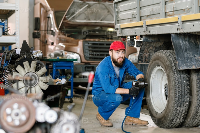 Бородатый уверенный техник в рабочей одежде, сидящий на приседаниях под колесом грузовика