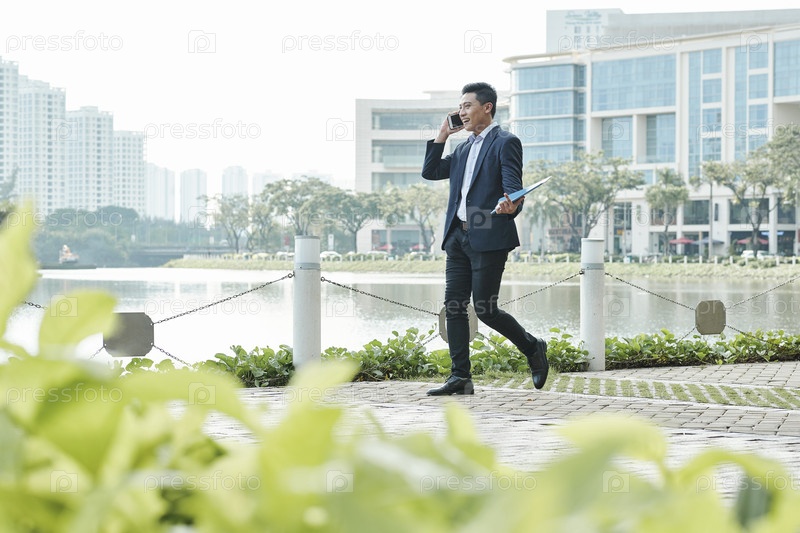 Веселый предприниматель звонит по телефону
