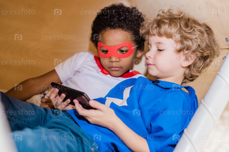 Два мальчика в костюмах Супермена смотрят на экран смартфона, отдыхая