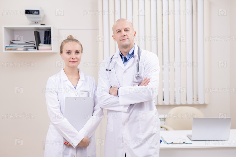 Два уверенных коллеги в медицинской форме, стоящие рядом друг с другом