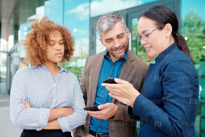 Два молодых сотрудника со смартфонами просматривают историю сообщений