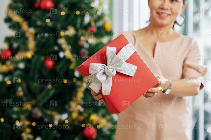 Женщина показывает рождественский подарок