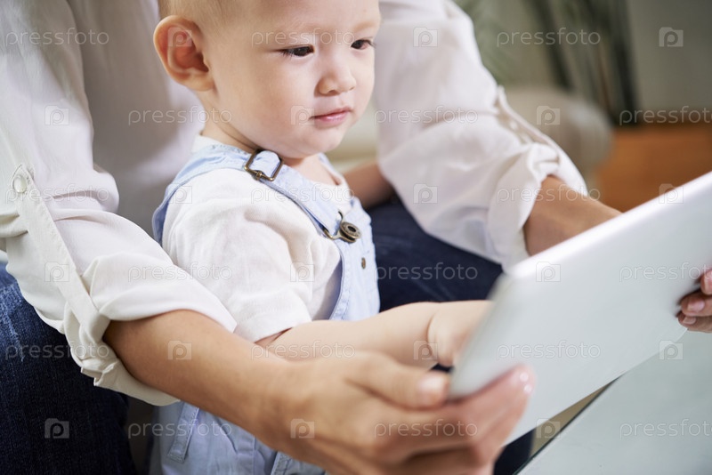 Мать показывает ребенку планшет