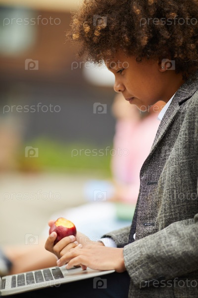 Мальчик, использующий ноутбук на открытом воздухе