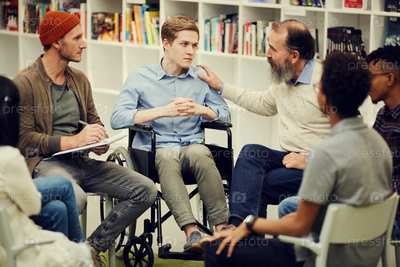 Группа людей, включая психотерапевта, сидящего в кругу в библиотеке и поддерживающего молодого парня на инвалидной коляске во время групповой терапии