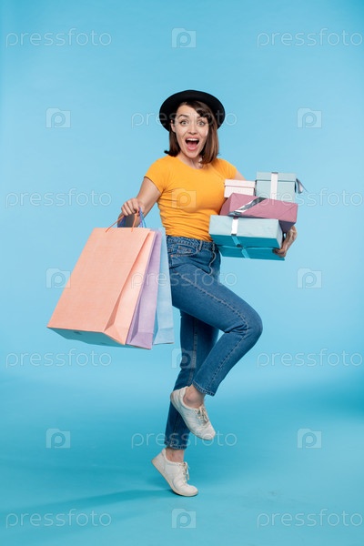Молодой взволнованный шопохолик с коробками для подарков и бумажными пакетами
