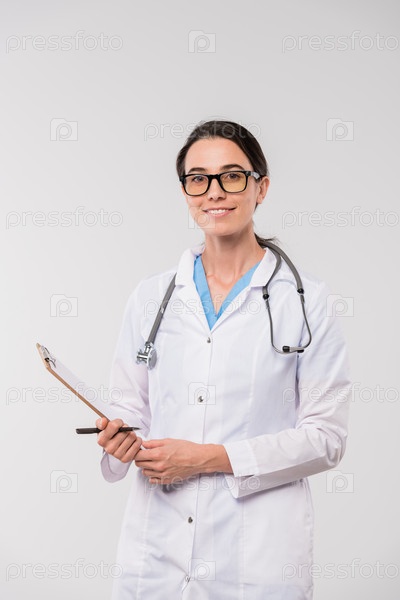 Молодая женщина-клиницист в медицинской форме и очках стоит на изоляции