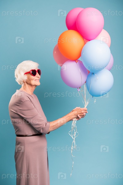 Элегантная и грациозная старшая женщина, держащая кучу воздушных шаров