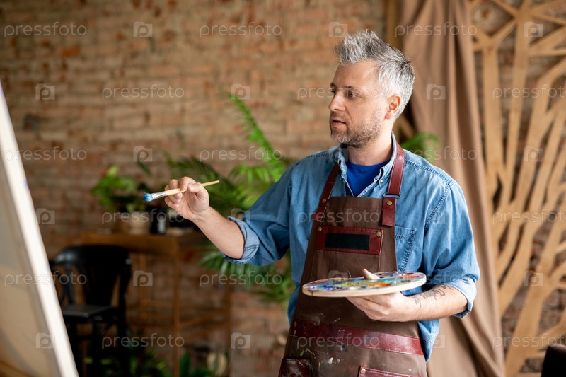 Вдохновленный художник с кистью и палитрой смотрит на незавершенную картину