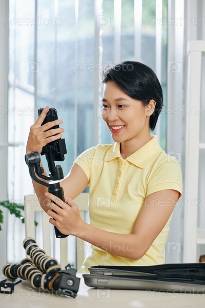 Женщина держит монопод со смартфоном и