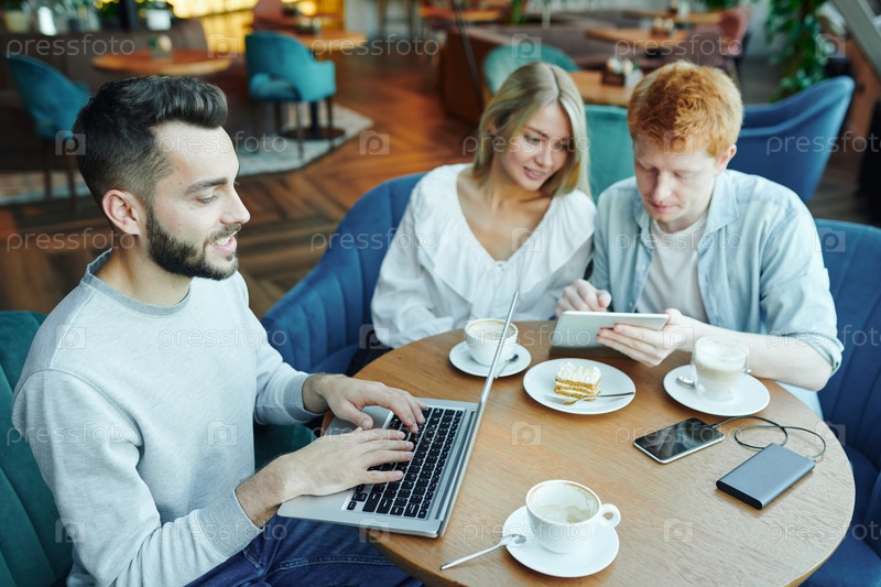 Молодой случайный мужчина сети перед ноутбуком, в то время как его друзья используют сенсорную панель