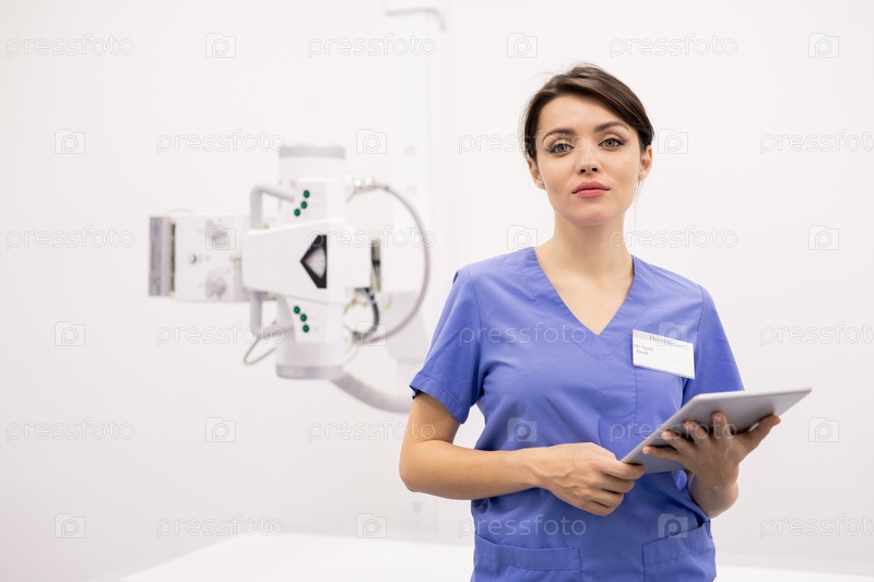 Красивая молодая стажерка в форме ищет онлайн-информацию на сенсорной панели