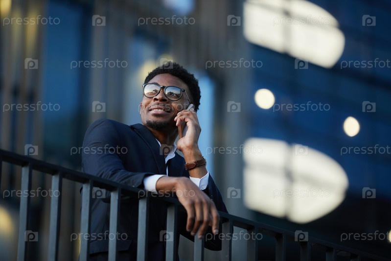 Контент красивый молодой афроамериканский бизнесмен в очках, опирающийся на перила и звонящий партнеру по бизнесу, стоя на балконе делового центра