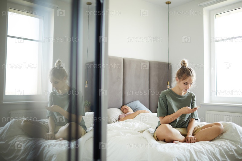 Молодая жена просматривает сообщения в смартфоне мужа