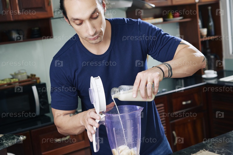 Мужчина готовит протеиновый коктейль