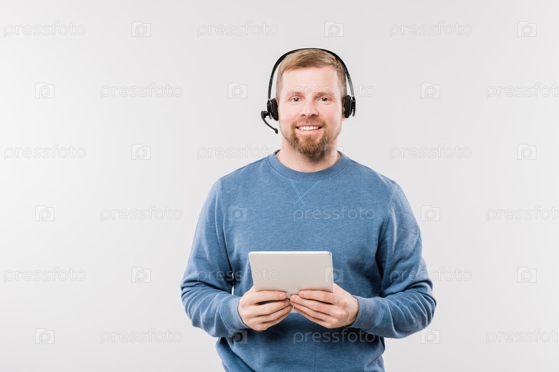 Счастливый молодой оператор в наушниках с использованием цифрового планшета, смотря на вас