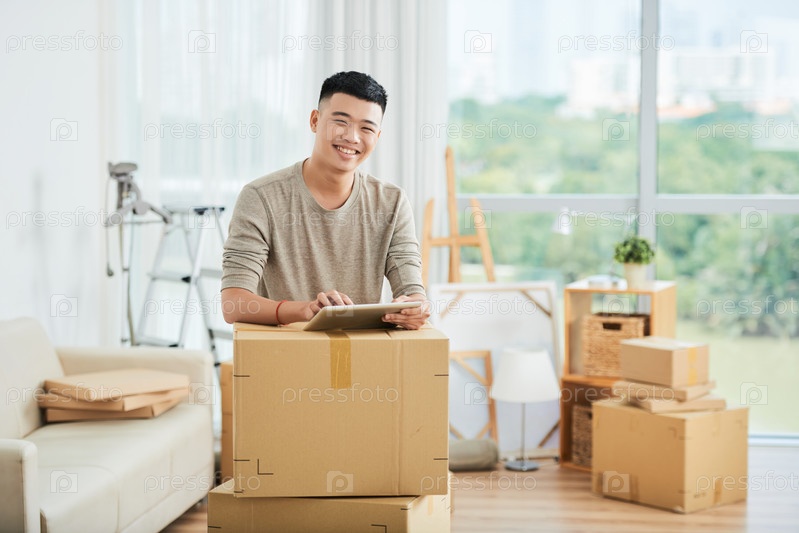 Азиат с упакованными коробками