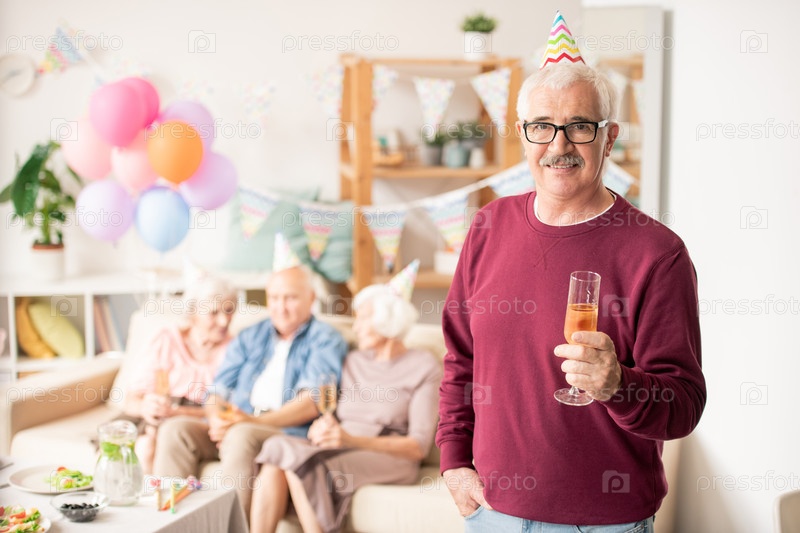Случайный пожилой мужчина с шампанским на фоне своих друзей