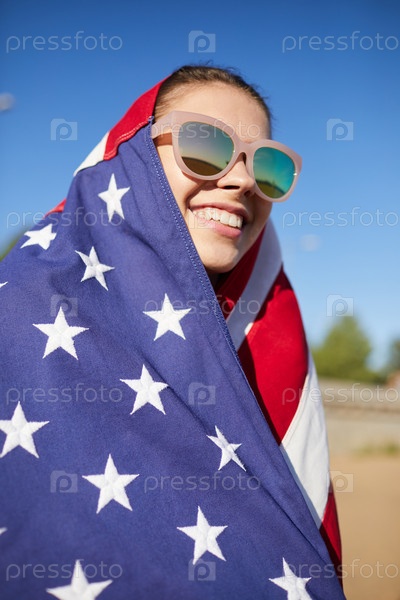 Счастливая американская девушка в солнцезащитных очках