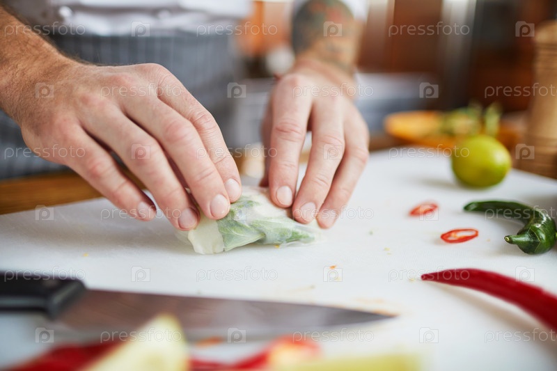 Повар, делающий овощные роллы