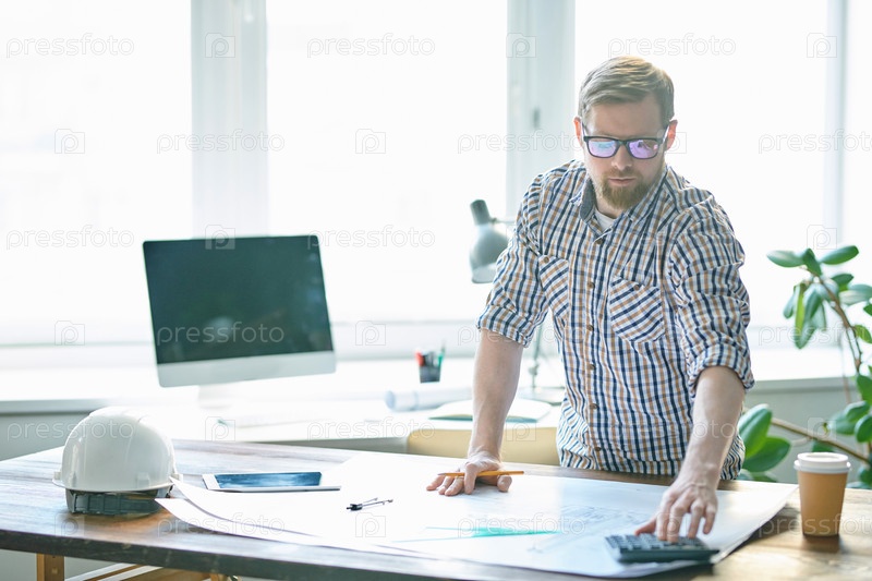 Серьезно сконцентрированный красивый молодой инженер с бородой, стоящий за столом и делающий расчеты во время работы с чертежом