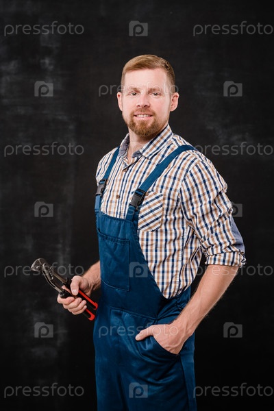 Счастливый молодой бородатый механик в комбинезонах и рубашке, использующий инструмент при работе