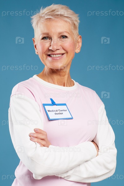 Портрет положительной уверенной в себе зрелой женщины-врача медицинской клиники, носящей значок и форму на синем фоне