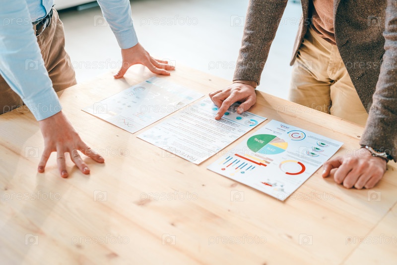 Два молодых экономиста в формальной одежде, склонившиеся над финансовыми документами на деревянном столе