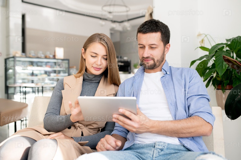 Случайная молодая пара, сидящая на удобном диване и прокручивая в сенсорной панели
