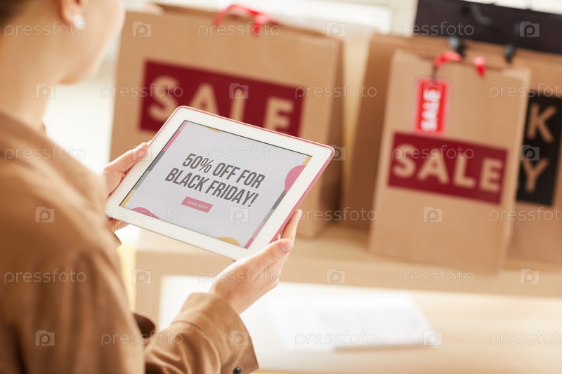Близкий снимок неузнаваемой женщины-клиента, использующей цифровой планшет во время чтения о новом продвижении онлайн-магазина
