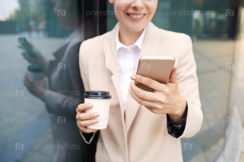 Близкий план позитивной дамы в куртке, стоящей рядом со стеклянным зданием на открытом воздухе и отправляющей сообщения через мессенджер на смартфоне
