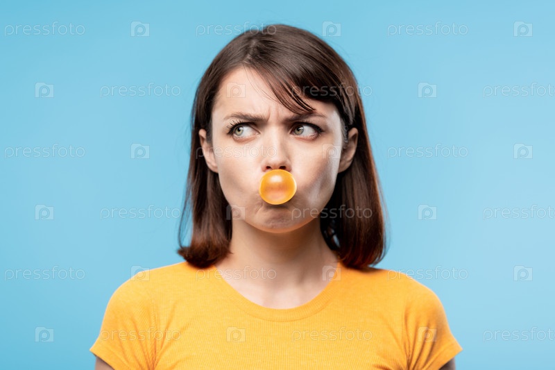 Брюнетка-подросток вдыхает пузырь из жёлтой жевательной резинки