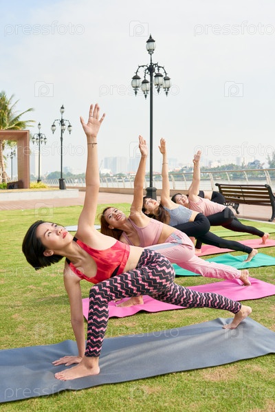 Женщины в ряд делают йогу асан на открытом воздухе