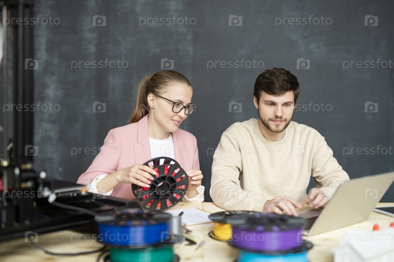 Молодые творческие коллеги с катушками из нитей сидят перед ноутбуком