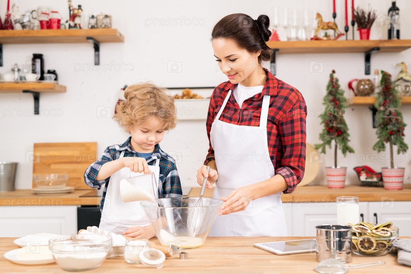 Маленький мальчик кладет сахар в миску с сырыми яйцами, помогая маме делать тесто