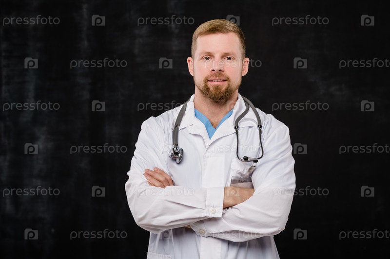 Бородатый молодой доктор в белом халате и фонендоскоп на шее