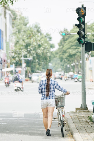 Молодая женщина, идущая на велосипеде