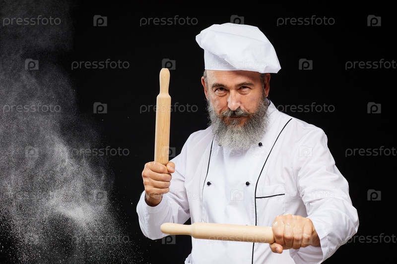 Бородатый старший пекарь позирует на черном