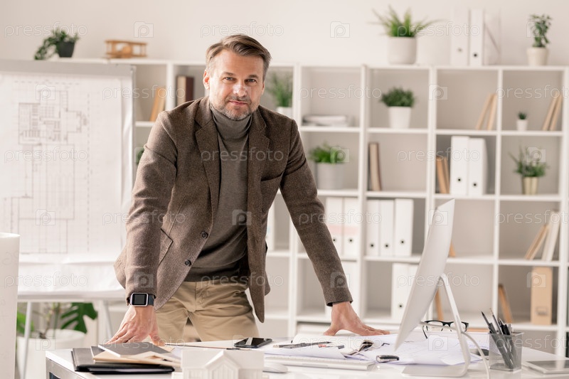 Успешный и уверенный архитектор в формальной одежде склоняется над столом в офисе