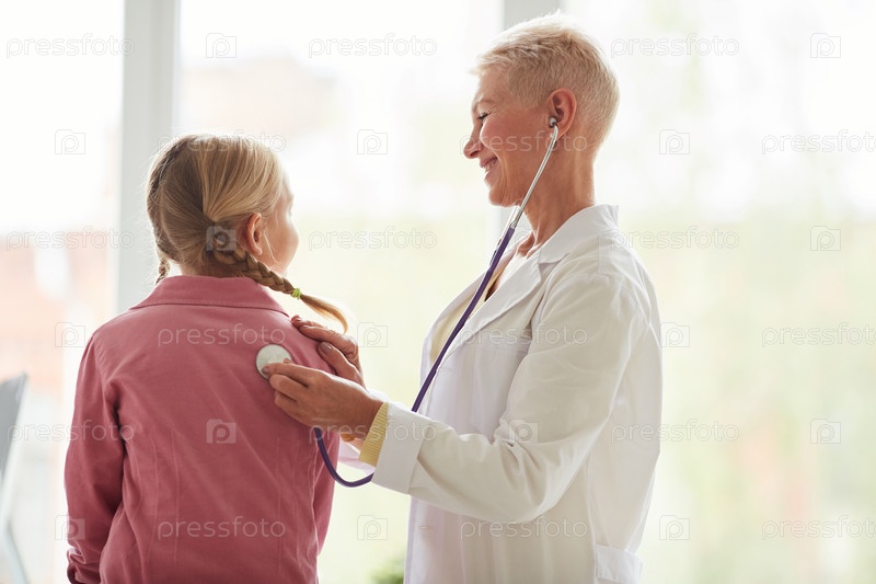 Позитивный привлекательный зрелый врач в лабораторном халате, стоящий в офисе и использующий стетоскоп во время прослушивания легких девочек