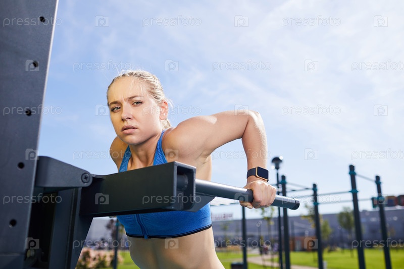 Портрет молодой мускулистой женщины со смарт-часом, практикующей трицепсный прыжок с помощью ленты на параллельных барах в открытом воздухе
