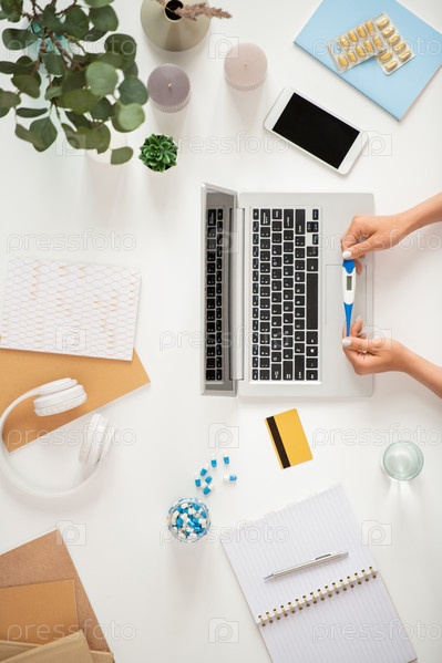 Больной человек с термометром на клавиатуре ноутбука заказывает лекарства онлайн