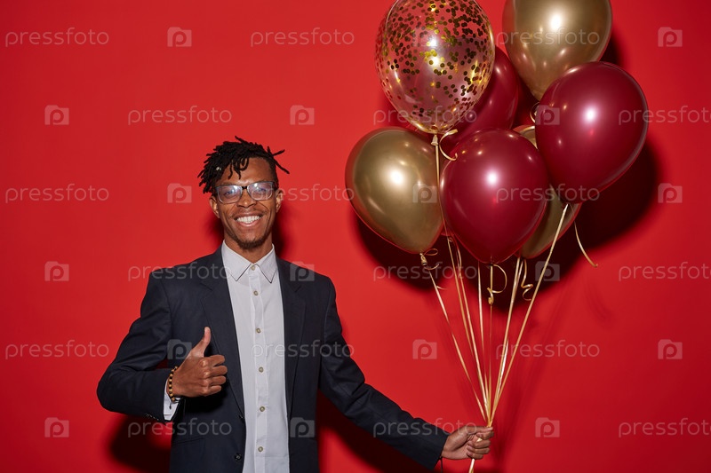 Модный африканский мужчина, держащий воздушные шары на вечеринке