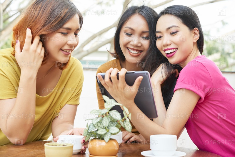 Друзья, использующие планшетный компьютер на открытом воздухе